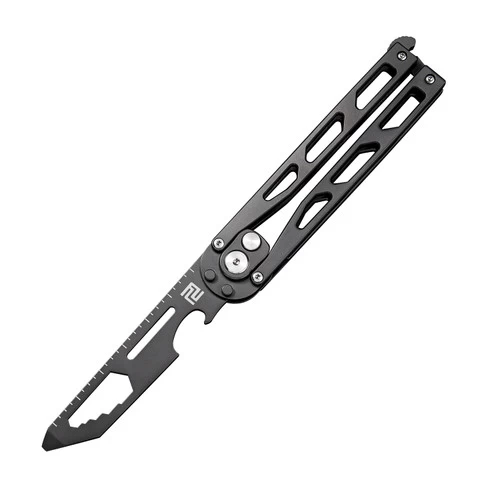 The Artisan Cutlery Mini Kinetic-Tool Black Stainless s a unique combination of a training knife and multi-tool. The dull tanto-style trainer blade is made from 8CR stainless steel and has several useful tools milled straight out of the steel. It has a bottle opener, a flathead screwdriver, a set of hex wrenches, a 3″ ruler, and can be used as a prybar. The handles are made from skeletonized stainless steel for reduced weight, and the flipping action is smooth as silk.