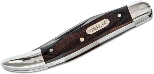 Traditional, compact pocket knife. This single bladed knife has a long, narrow clip blade for detailed cutting. The traditional 385 Toothpick from Buck has a woodgrain handle with nickel silver bolsters and a stainless steel slip joint mechanism.