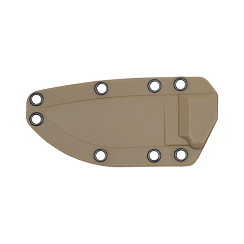 This ESEE-3 model features a plain edge blade with a black powder coating, micarta handle, and a plastic Coyote Brown sheath.