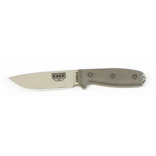 This ESEE-4 model features a plain edge blade with a Desert Tan powder coating and a micarta handle. This model does not include a sheath.