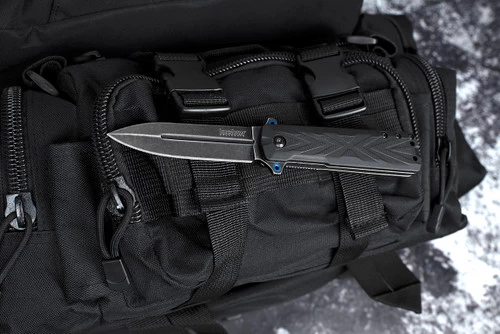 The Kershaw Barstow is a little wicked and a lot of value. Everything about this slim folding knife is simple, direct, and ready. The straight spear-point blade is sharpened on a single side. The handle has glass-filled nylon scales with heavy arrow-patterned texture to enhance grip. The Barstow’s dark good looks are set off by touches of subtle color—blue anodized tube spacers and rings in the flipper/fingerguard.