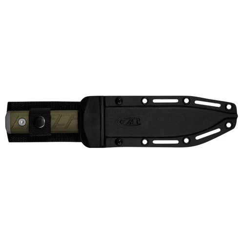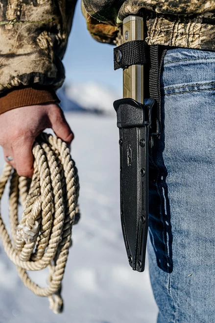 - Kydex sheath with secondary retention strap for travel; includes slots, drainage hole, and can be carried left- or right-handed, high or low carry