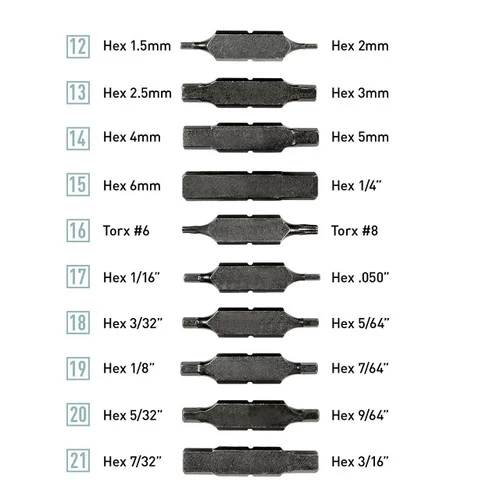 The Bit Kit expands your driver’s capabilities with 21 double-ended bits—42 tools in all. Use the Bit Kit with all tools and knives with bit drivers and Removable Bit Driver. The Bit Kit Includes: Square Drive #1 and #2 Torx #15 and Hex 7/64 Torx #6 and #8 Torx #10 and #15 Torx #20 and #25 Torx #27 and #30 Eyeglasses Screwdriver Pozi #2 and #1 Hex 1.5mm and 2mm Hex 2.5mm and 3mm Hex 4mm and 5mm Hex 6mm and 1/4″ Hex 7/32″ and 3/16″ Hex 5/32″ and 9/64″ Hex 1/8″ and 7/64″ Hex 3/32″ and 5/64″ Hex 1/16″ and .050″ Phillips #0 and #3 Phillips #1 and #2 Phillips #2 & 1/4″ Screwdriver Phillips #1-2 and #3 Screwdriver 3/32″ and 1/8″ Screwdriver 5/32″ and 3/16″ Screwdriver 7/32″ and 1/4″ Screwdriver 1/8″ and Torx #15 Screwdriver 1/4″ and 3/16″ Phillips #2 and 3/16″ Screwdriver