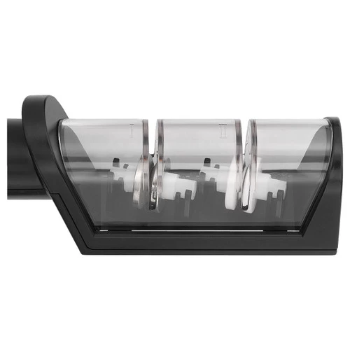 With the Miyabi knife sharpener with ceramic rollers, your knives can be sharpened more smoothly and in greater comfort. The sharpener features a pre-set sharpening angle so that your knife is always in the right position. The blade is first pulled through the diamond-coated roller several times to achieve a beautiful cutting edge. The knife is then pulled through the ceramic rollers several times at the end of the sharpening process. This makes the knife exceptionally sharp so that it can effortlessly cut through meat, fish and other foods. Silicone grippers help the knife sharpener stay stable as you work so that it doesn’t slip. The ergonomic handle is made from easy-care plastic and can be comfortably held by both left-handed and right-handed chefs. This knife sharpener can also be used to sharpen non-serrated knives made from different steel types, as well as knives from the Miyabi range. With this Miyabi knife sharpener, sharpening your knives couldn’t be easier.