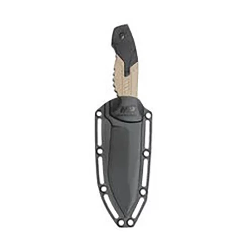 The Smith & Wesson M&P Striker fixed blade is great for your camping or tactical cutting needs. It is made from black finished stainless-steel and features a partially serrated tanto fixed blade and a black and tan aluminum handle. Includes black plastic belt sheath.