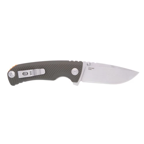 Accomplish outdoor tasks with a single free hand due to the SOG Tellus ATK’s assisted opening frame lock mechanism. The open frame lock design has been engineered to mitigate the effects of dirt, mud and other debris that can foul more complicated systems and the blade locks on to the sturdy metal frame and simulates the strength of a rugged fixed blade knife. The deep belly CYRO 440C stainless steel blade provides plenty of backbone to this outdoor workhorse while offering a sharp and durable edge. The OD green GRN handle is durable and textured to provide a sure and safe grip in the wet or dry, with gloves and without.