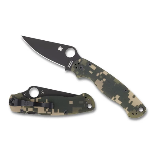 The Spyderco Para Military 2 Digital Camouflage Black Blade G-10 has several changes over the classic version. The G-10 handle is narrowed at the end improving the ergonomics. It features a Compression Lock® and an ambidextrous-friendly four way clip which carries tip-up/tip-down, left/right-hand and rests deeper in a pocket.