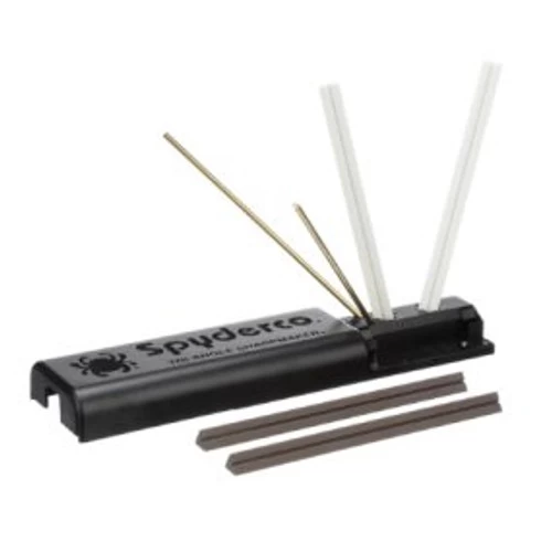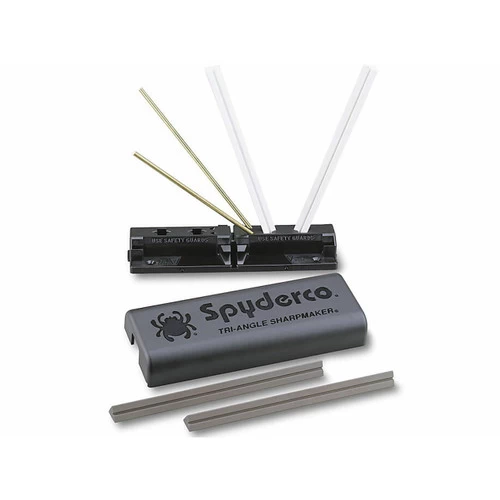 The Tri-Angle Sharpmaker (204MF) includes two sets of high alumina ceramic stones: A pair of medium-grit (brown) 7″ X 0.5″ (178mm X 13mm) stones for aggressive sharpening and a set of fine (white) 7″ X 0.5″ (178mm X 13mm) stones for professional grade finishing. The stones are triangular for sharpening Plainedges on the flat sides and SpyderEdges (serrations) on the corners. A furrow running the length of each stone lets you sharpen pointed items like fishhooks, darts and awls. Included is a set of brass safety rods protecting the users hands while sharpening. All components snap into the self-contained ABS plastic base and lid — ready to travel with you. Die-cut into the base are keyed slots and holes fitted for the stones. They accurately set the stone’s sharpening angle at a 30° (15° each side) or 40° (20° each side) for knives and a 12.5° scissor setting. Turn the base over, a channel lets you lay two stones side-by-side (flat-side up) for use as a benchstone. The lid snaps halfway over the base creating a handhold for stability while you’re sharpening. Included is a set of brass safety rods to protect the users hands while sharpening. Ceramic stones, like glass, will break if dropped — handle carefully.