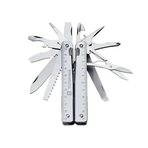 The Victorinox SwissTool X is equipped with 22 tools including: Pliers, Screwdriver (2mm), Screwdriver (3mm), Wire cutter (for wire up to a hardness of 40 hrc), Screwdriver (5mm), Bottle opener, Screwdriver (7.5 mm), Large blade, Scissors, Metal file, Metal saw, Wood saw, Reamer/punch, Phillips screwdriver, Chisel/scraper, Strong crate opener, Wire bender, Wire stripper, Wire scraper, Wire crimper, Can opener, Ruler (9 inches), Ruler (230mm), Hard wire cutter, Lanyard hole, Easy kickback springs, Lock release, Stainless steel. Comes with nylon belt pouch.