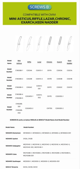 Made of premium titanium, this black clip and screws are durable and sturdy and fit a selection of CIVIVI, WE Knife Co, and SENCUT knives. You will get 1PC titanium clip and 6PCS titanium screws, 6PCS screws are divided into 3 packages, they are packaged in A, B, C which fits different knives.