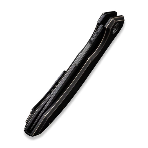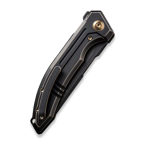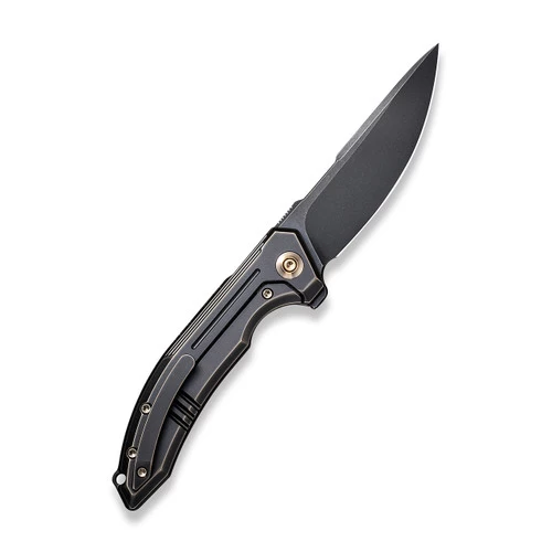 This model features a black stonewashed CPM 20CV blade and a black and bronze finished titanium handle.Â