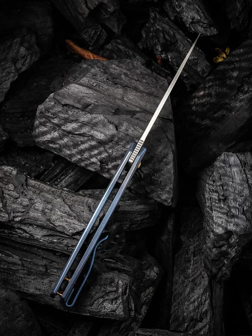 This model features aCPM-20CV Hand Rubbed Drop Point Blade, Blue Stonewashed Titanium Handles with Bronze Accents