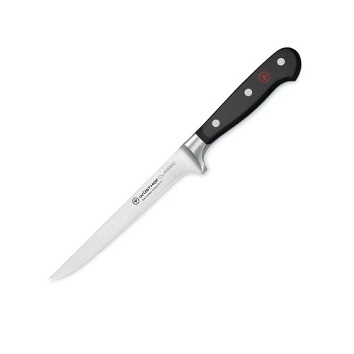 The Wüsthof Classic 6” flexible boning knife features a narrow ‘S’-shaped blade and is perfect for removing bones from meats and poultry and other tasks requiring a maneuverable blade. Stiff boning knives are best for beef and pork, while flexible ones are better for poultry and fish. Uses include “Frenching” racks of lamb, trimming silverskin off of tenderloins, and even coring and trimming pineapple. Try this boning knife and see how quick and easy it really is to debone a chicken.