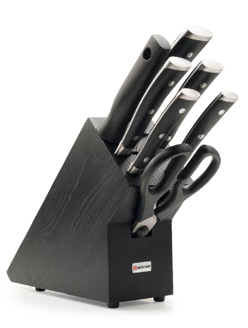 Set up your kitchen with all the essential knives and tools of an at-home chef. This contemporary black wood block comes with the 5 most useful knives as well as a sharpening steel to keep them in great condition and a set of shears. Classic Ikon knives feature a sleek contoured black handle with a double bolster for exceptional balance, beauty, and the ultimate cutting experience. Each Wusthof Classic Ikon knife is precision-forged from one piece of high-carbon steel, perfectly balanced, and designed for extreme comfort and control. The sweet-spot on the underside of the triple-riveted handle aligns within the hand for a perfect fit and hours of use.